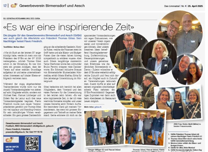Der Gewerbeverein Birmensdorf und Aesch vertritt die Interessen von 126 Gewerbe-, Dienstleistungs- und Handelsbetrieben in den Gemeinden Birmensdorf und Aesch.Wir setzen uns für die Erhaltung undFörderung von leistungsfähigen KMU ein, wir sind für unsere Mitglieder und die Bevölkerung politisch aktiv . Hier finden Sie Informationen über das Gewerbe in unseren Gemeinden, über die Zielsetzungen und Anlässe des Gewerbervereins Birmensdorf und Aesch und aktuelle Neuigkeiten die auch Sie interessieren werden.Freundliche GrüsseIhr GVBA